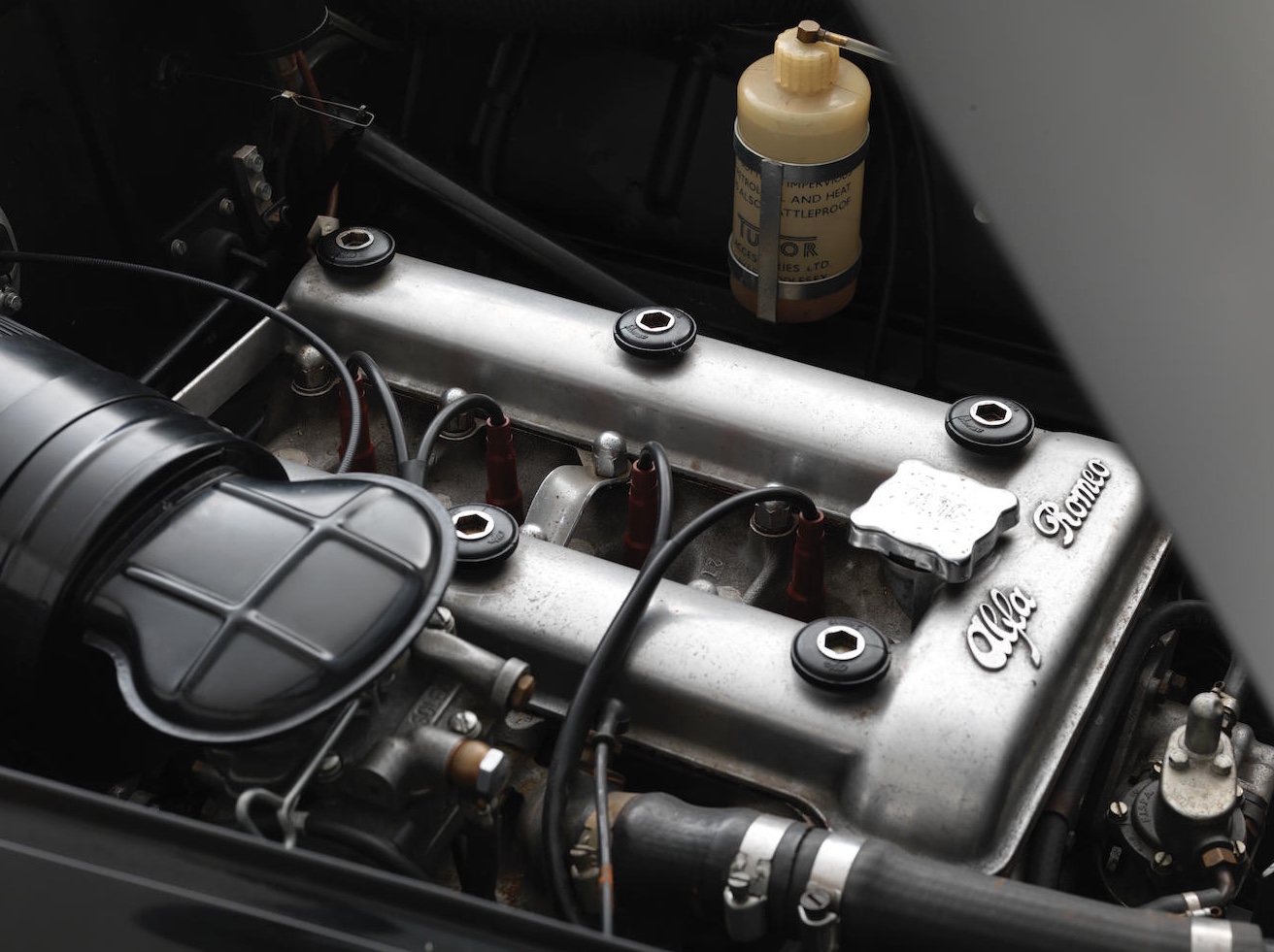 Es war eine wahre Freud’. Die Giulietta Sprint verfügte über einen komplett neu entwickelten 1,3-Liter-Vierzylinder (Bohrung x Hub 74 x 75 mm, 1290 cm3), dessen Zylinderkopf und Motorblock aus einer Alu-Legierung bestanden. Es gab zwei obenliegende, kettengetriebene Nockenwellen und über Tassenstössel betriebende hängende Ventile, was den Vierzylinder in der Giulietta Sprint problemlos (und ausdauernd) über 6000/min drehen liess; die Leistung wurde mit 80 PS bei 6000/min angegeben, das maximale Drehmoment mit 102 Nm bei 3500/min. Die Höchstgeschwindigkeit des 880 Kilo schweren Fahrzeugs lag schon 1954 bei stolzen 165 km/h. Hinten gab es eine Starrachse an Längslenkern und am Differentialgehäuse angelenkten Dreieckquerlenkern, dazu Schraubenfedern, vorne war es eine moderne Einzelradaufhängung mit doppelten Dreieckslenkern, ebenfalls mit Schraubenfedern und Querstabilisatoren; die Trommelbremsen vorne und hinten waren sehr grosszügig dimensioniert. Das leicht untersteuernde Fahrverhalten ist heute noch: grossartig. Und das Design ist heute noch: grossartig.