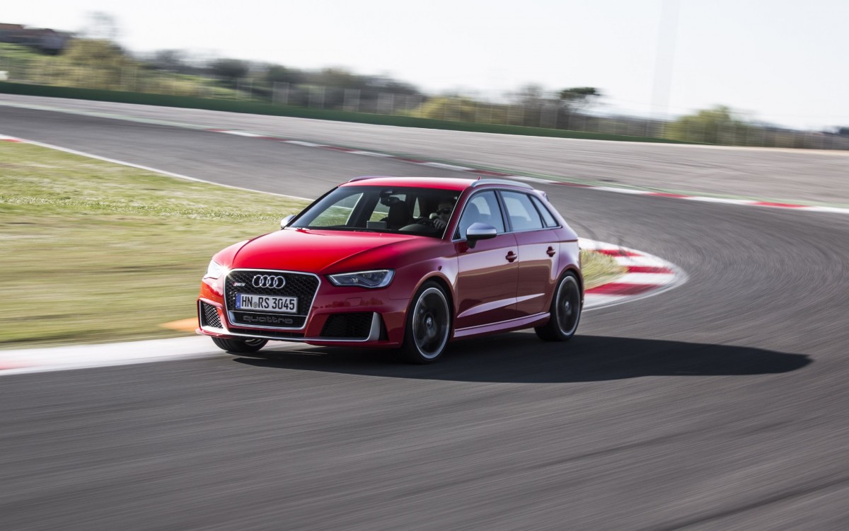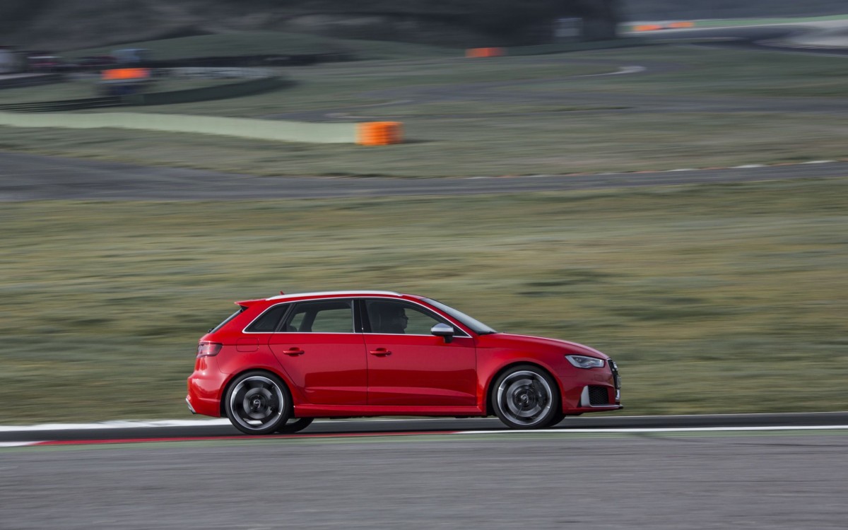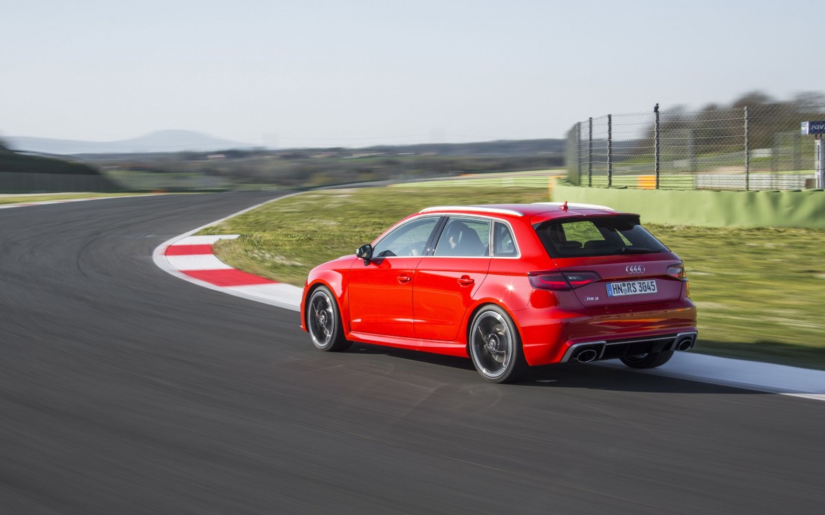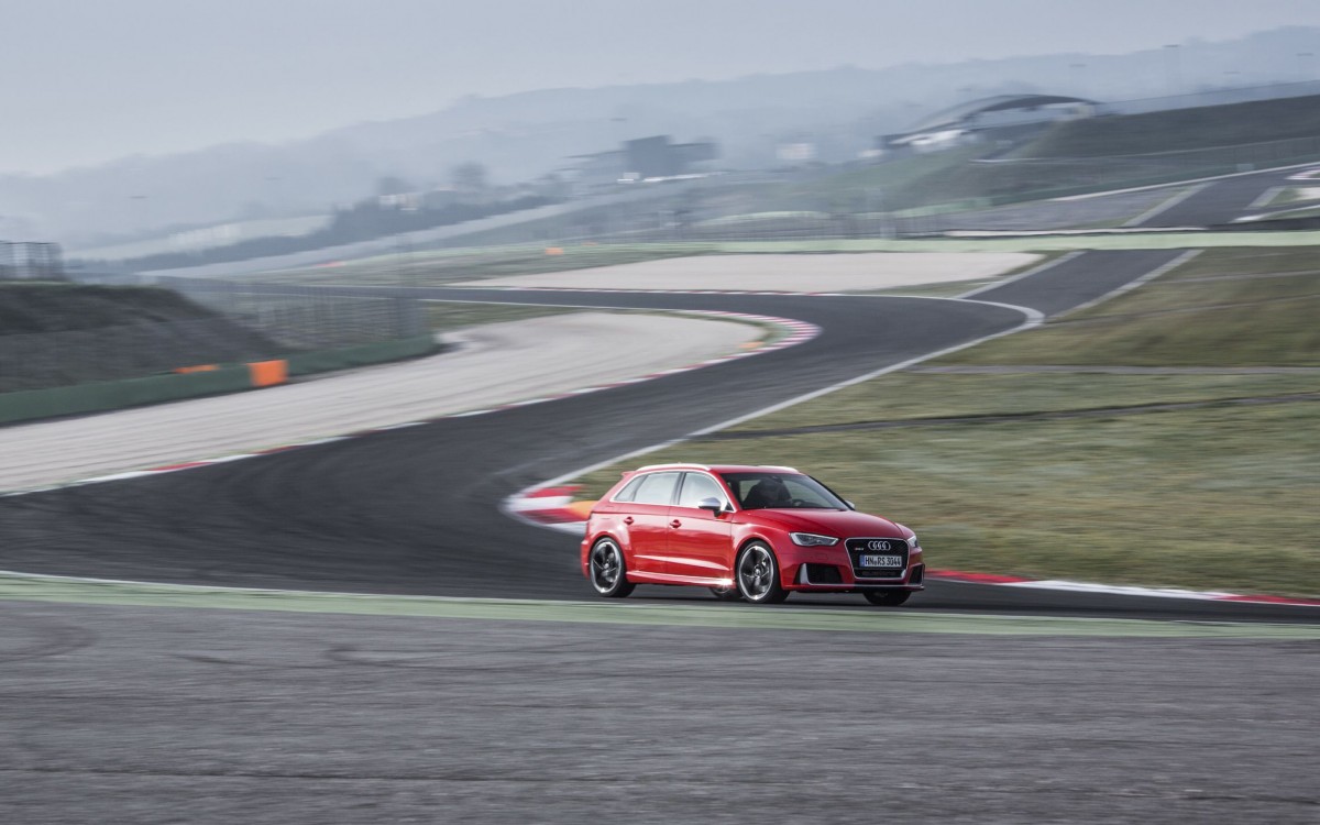 Audi ist von dem Gesamtpaket daher so überzeugt, dass sie uns bei Rom über die Rennstrecke Autodromo Vallelunga schickten. Doch irgendwie fanden wir diese Idee gar nicht so gut, denn der vier Kilometer lange Rundkurs mit ultragriffigem Belag und brutal hart anzubremsenden Kurven deckt gnadenlos den Charakter des Fünftürers auf. Die gute Nachricht zu erst: die Bremse hält! Besonders, wenn – wie auf unserem RS3 – die optionale Keramikbremse montiert ist. Doch leider nagelt auch die neue elektronisch gesteuerte und hydraulisch betätigte Lamellenkupplung an der Hinterachse das Heck wieder spassverderbend auf den Asphalt. Obwohl Audi vollmundig behauptet, dass in Abhängigkeit von Fahrstil und Reibwert bis zu 100 Prozent der übertragbaren Antriebskräfte an die Hinterachse geleitet werden können. In der Realität kommt dort nur maximal die Hälfte der Kraft an. Will man wirklich 100 % an den Hinterrädern, muss man schon mit dem Wagenheber die Vorderachse in die Höhe pumpen, bis die Räder hilflos in der Luft baumeln.