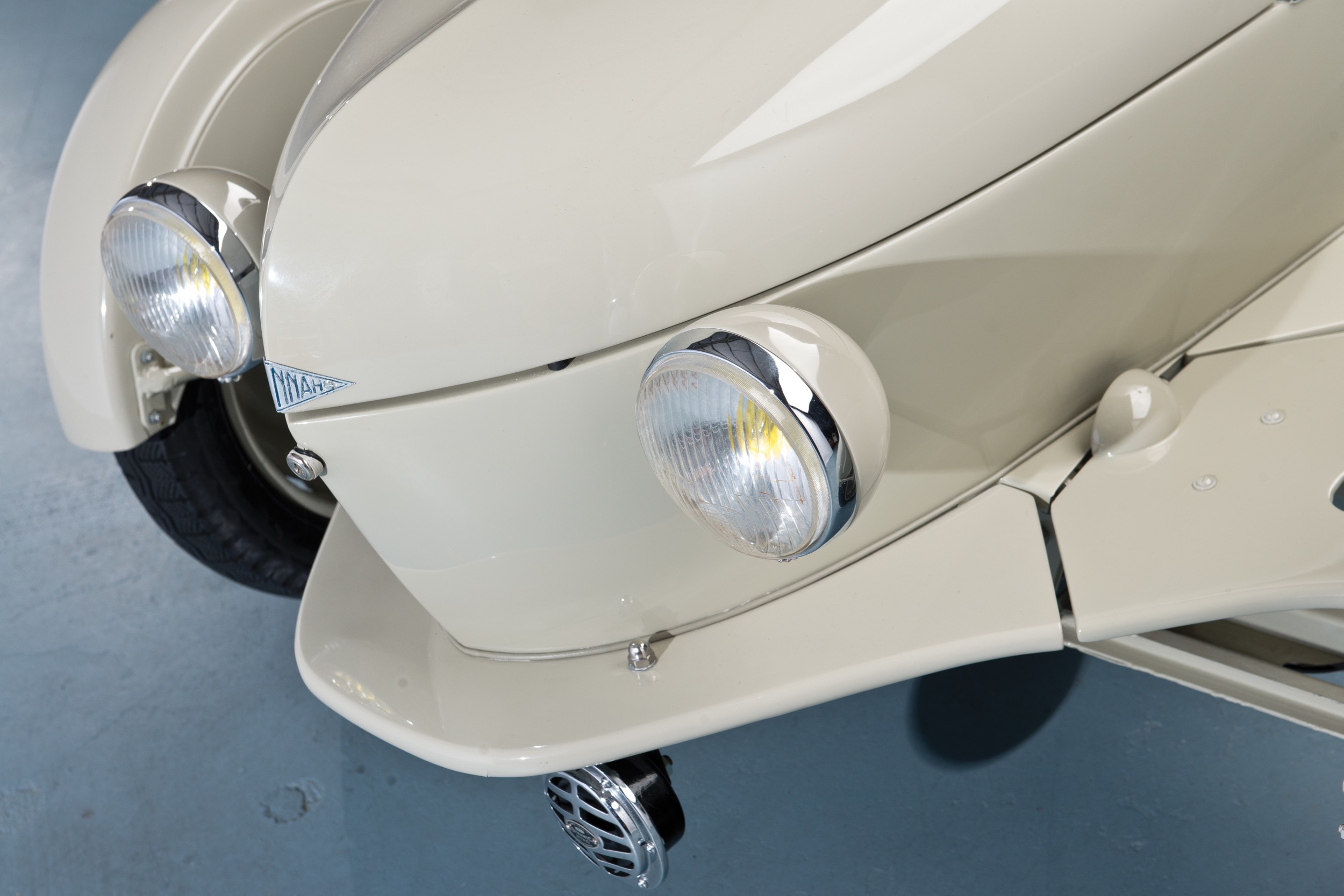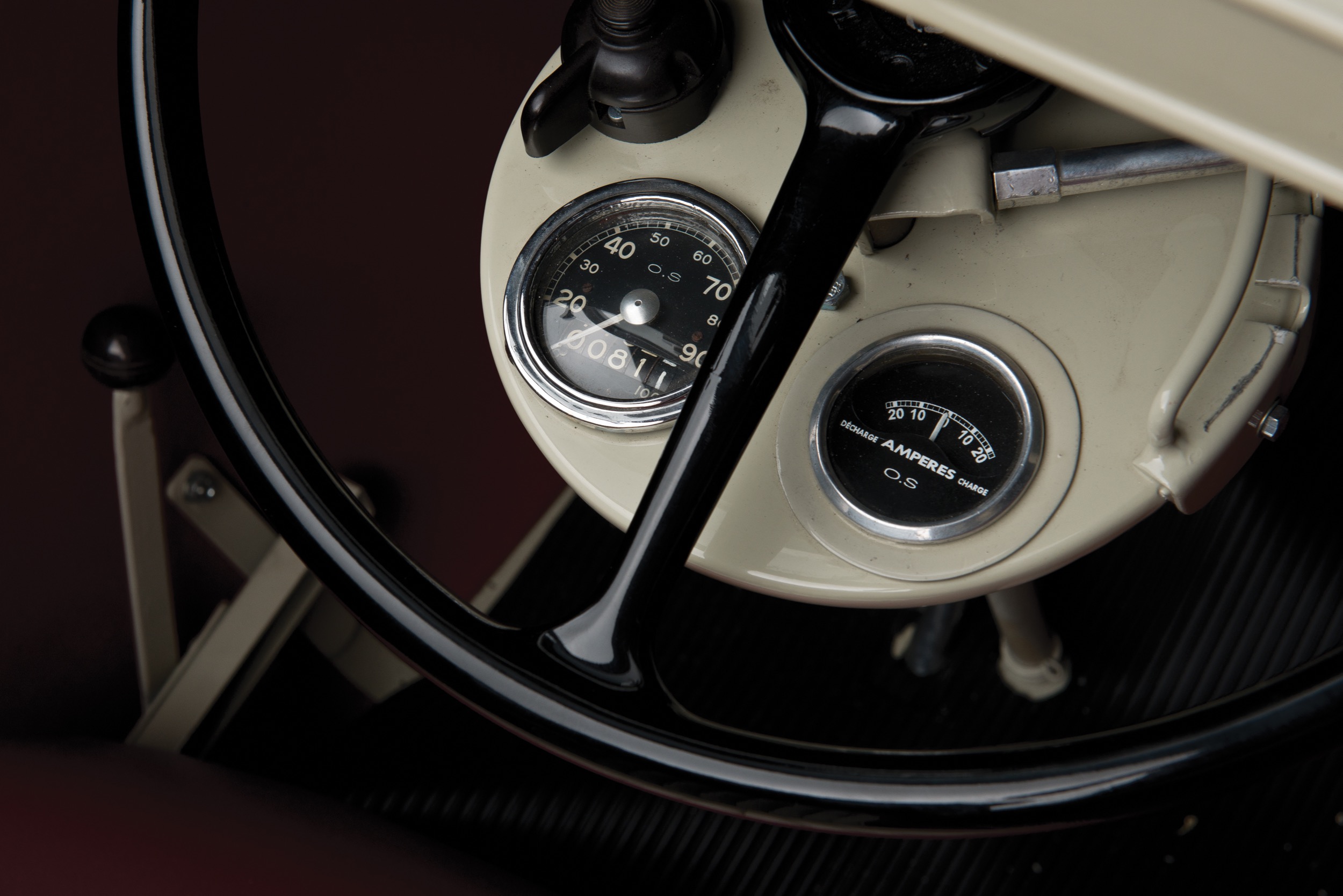 Es heisst, dass Monsieur Hannoyer schon 1947 auf die Lösung stiess. Und auch einen Prototypen baute. Doch erst 1950, auf dem Salon von Paris, stellte er seine Konstruktion erstmals einem breiten Publikum vor. Das Fahrzeug, das keine eigene Garage brauchte und auch nicht unter den Laternen parkiert werden musste, nannte er Reyonnah (lesen Sie Hannoyer mal rückwärts…). Das Design war sicher inspiriert von den damals gerade in Mode gekommenen Kabinenrollern, etwas dem Messerschmitt. Wobei der Reyonnah anfangs keine Kabine besass, zumindest im ersten Jahr nicht, sondern ein Zelt. Das sich aber nicht nach hinten ab- oder zusammenklappen liess, sondern seitlich als Ganzes weggeklappt wurde. Später gab es auch eine Blechkuppel mit zwei Seitenfenstern und einem Glasdachdeckel sowie schliesslich auch noch ein Plexiglas-Kuppeldach – nicht schlecht, diese Vielfalt, für gerade einmal 16 gebaute Fahrzeuge… . Die zwei Passagiere sassen hintereinander, gelenkt wurde über ein vollwertiges, sogar riesiges Lenkrad – das absolut horizontal stand. Auch die zwei Instrumente lagen komplett flach, keine Ahnung, wie man da etwa sehen wollte.