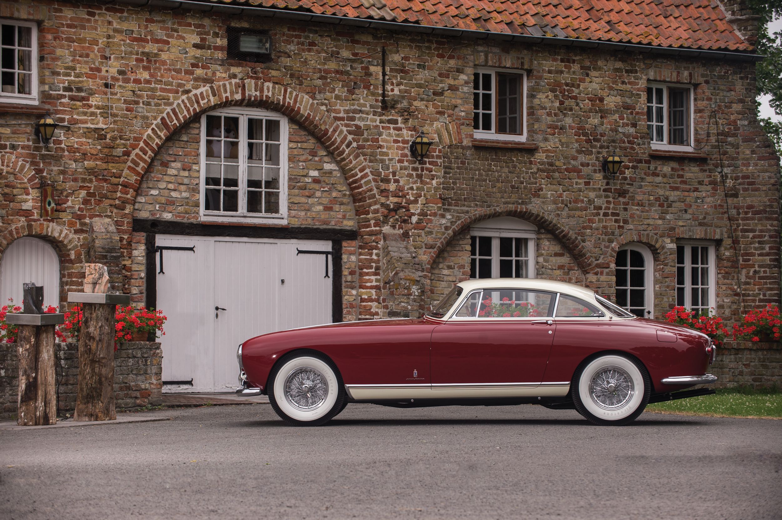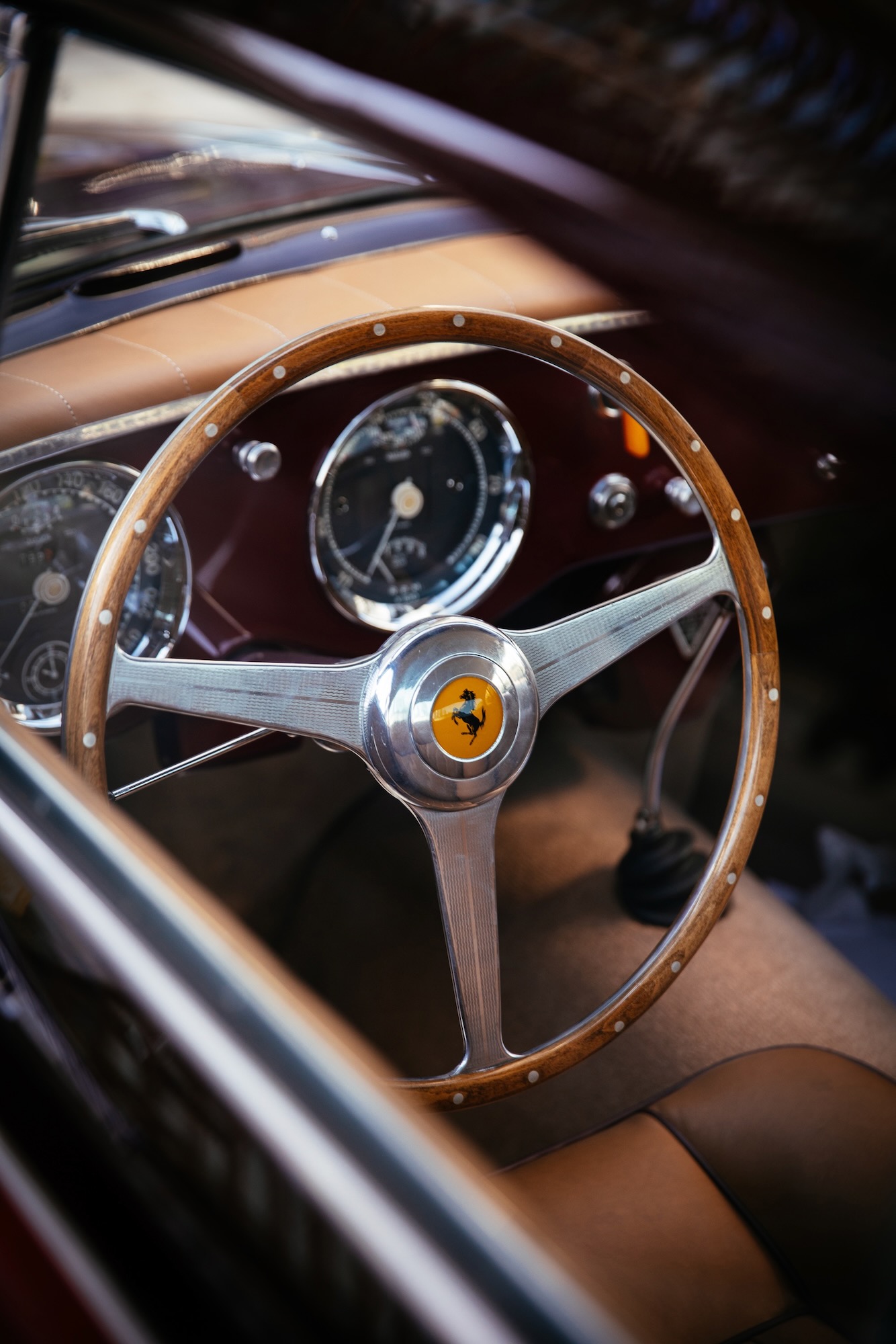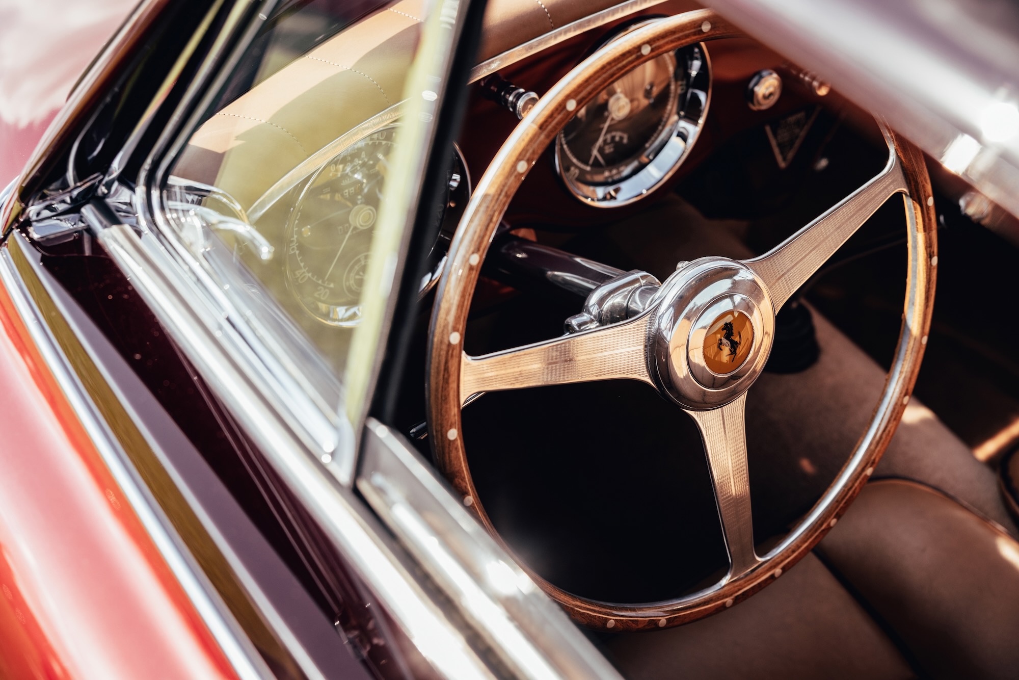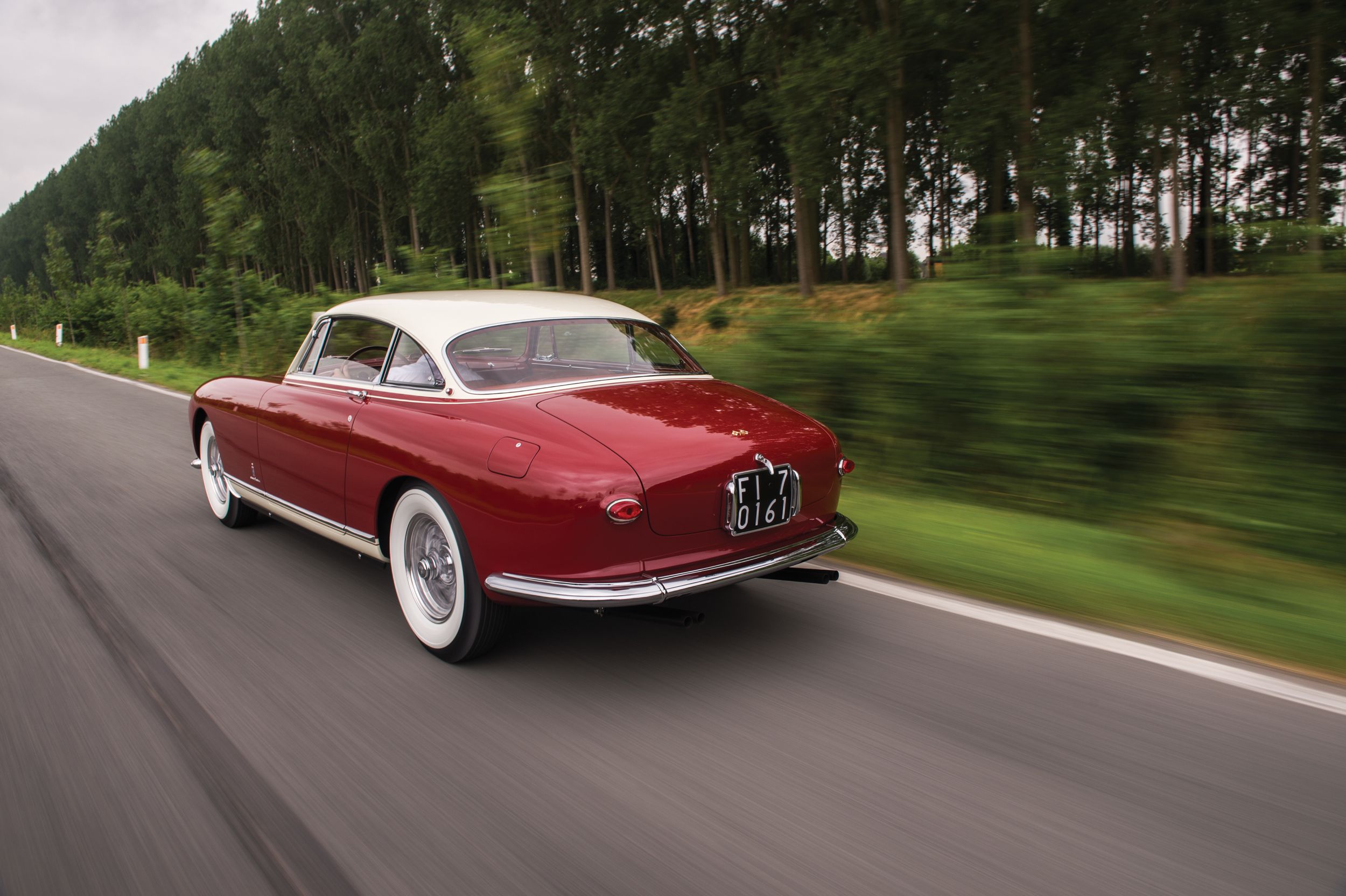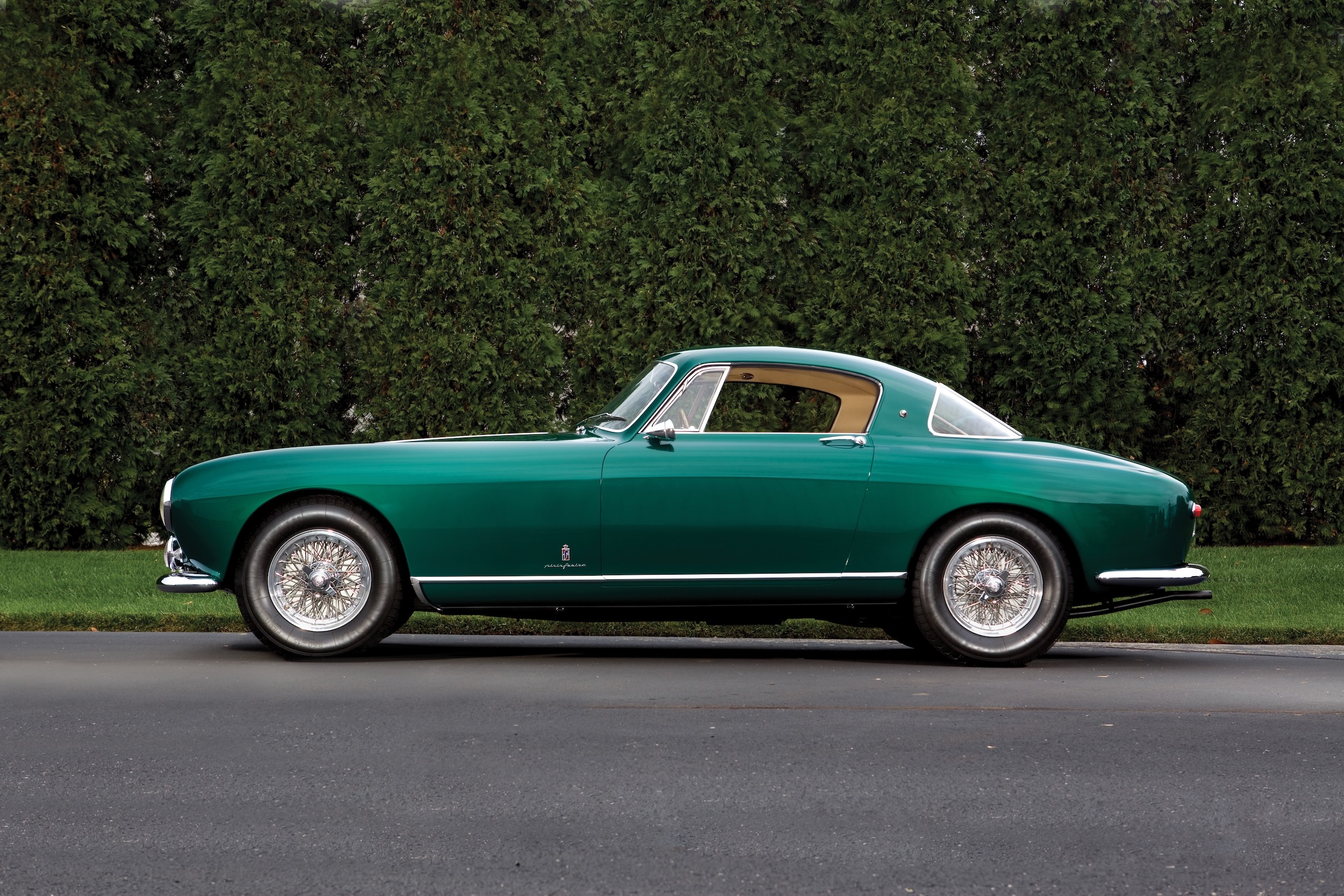 Der oben wie auch unten gezeigte 0305 EU ist ein ganz frühes Modell, das vierte in der Serie. Das Chassis kam am 29. September 1953 aus Maranello zu Pinin Farina, die Karosse wurde in Rosso Marrone sowie Beige lackiert, innen gab es Leder ebenfalls in Marrone und dazu die passenden Stoff-Applikationen in Beige. Aussergewöhnlich: der Tankdeckel befand rechts auf dem hinteren Kotflügel, alle anderen 250 Europa hatten den Stutzen – im Kofferraum. Pinin Farina stellte 0305 EU am 24. Dezember 1953 in Rechnung, verkauft wurde das Fahrzeug am 15. März an den italienischen Unternehmer Giovanni Latino. Der ein guter Freund von Pinin Farina war, das Fahrzeug bei verschiedenen Concorso d’Eleganza und auch Rennen herzeigte, also so ein bisschen Werbung machte für den Meisterschneider.