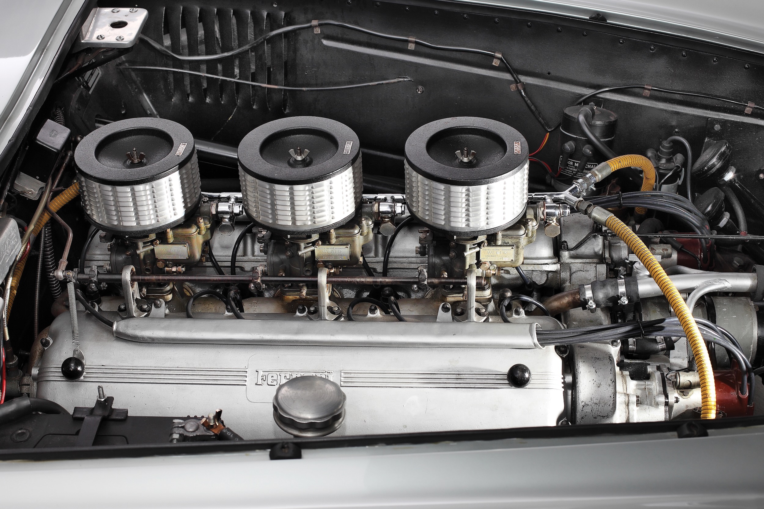 12 x 250 = 3000. Also: 3 Liter Hubraum. Einfach, damit das schon mal geklärt wäre mit der Nomenklatur der 250er-Ferrari. Wir wollen uns in unserer Serie dieser 250 natürlich hauptsächlich mit den GT befassen, also: V12, 3 Liter Hubraum, der Colombo-Motor. Doch der kam ja erst 1954 (ausser: siehe ganz unten). Wir haben hier einen 53er 250 Europa, und der hatte zwar schon den richtigen Namen und auch den richtigen Designer, also Pinin Farina. Doch noch nicht die Colombo-Maschine, sondern noch den klassischen Lampredi-V12, 68 x 68 Millimeter Bohrung x Hub, ca. 200 PS bei 7000/min. Der 250 Europa, von dem 21 Stück (oder doch 22, wie jüngste Forschungen ergeben haben wollen?) gebaut wurden, gehört also nicht wirklich zu den legendären 250ern, doch er ist eine gute Einstimmung auf das Thema. Wir wollen ja ganz langsam vorgehen, ist schliesslich eine komplexe Geschichte.