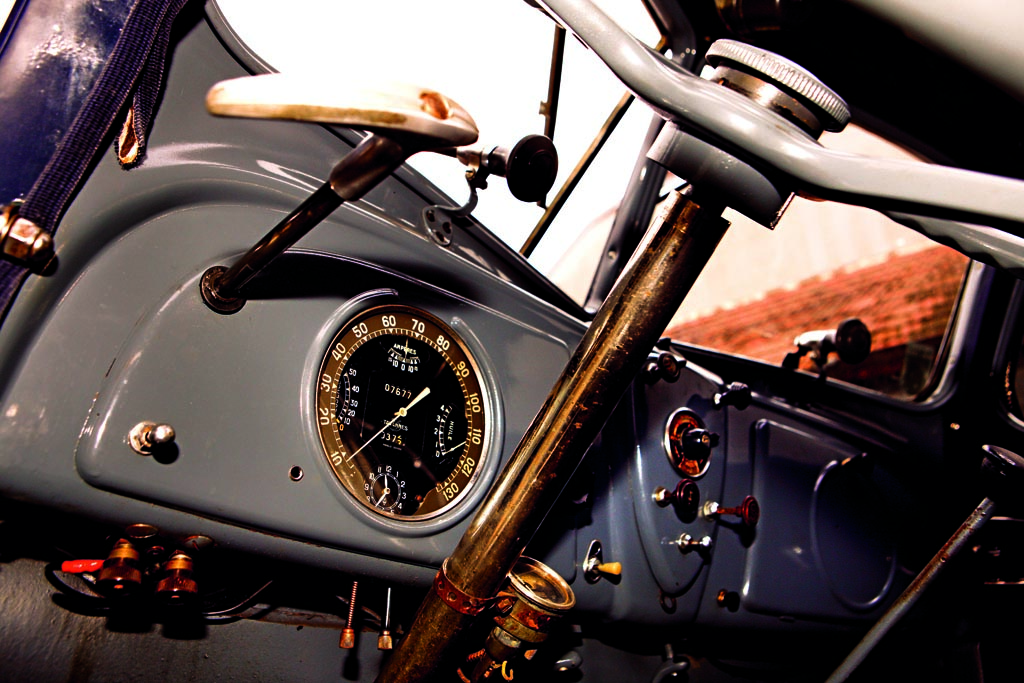 Beim Fahren fühlt er sich bis heute kaum gestrig an: Der Lenker arbeitet nicht, er bedient die technischen Organe des Automobils, lässt feinnervig die Handgriffe ineinander fliessen, berührt Chrom oder Bakelit, gönnt den Zahnrädern des Getriebes etwas Zeit, um zueinander zu finden, fährt sonst aber erstaunlich modern, aufrecht, luftig. Lediglich an der Breite merkt man, wohin Autos bis heute gewachsen sind. Und lenken sollte man nie im Stand: Es geht nämlich nicht, und wer die Umlenkungen des Gestänges verfolgt, ahnt die Gründe. Autofahren bestand in der Vorkriegszeit noch mehr aus Ritualen denn aus Beiläufigkeit, das beginnt schon beim Starten: Zündung ein, Zündzeitpunkt Richtung Frühzündung einjustieren, Choke ziehen, Startzug ziehen. Dennoch ist das Armaturenbrett schlicht und aufgeräumt: Der Lichtschalter sitzt in der Lenkradnabe, die Heizung trägt man am Körper. Beschlagen die Frontscheiben, dann stellt man sie ein wenig aus und fächelt ihnen (und sich) Luft von aussen zu. Auch verfügt der 302 über eine geniale Vorrichtung zum Benzinsparen. Man dreht dazu an einem Rädchen und beschränkt so den Gaspedalweg.