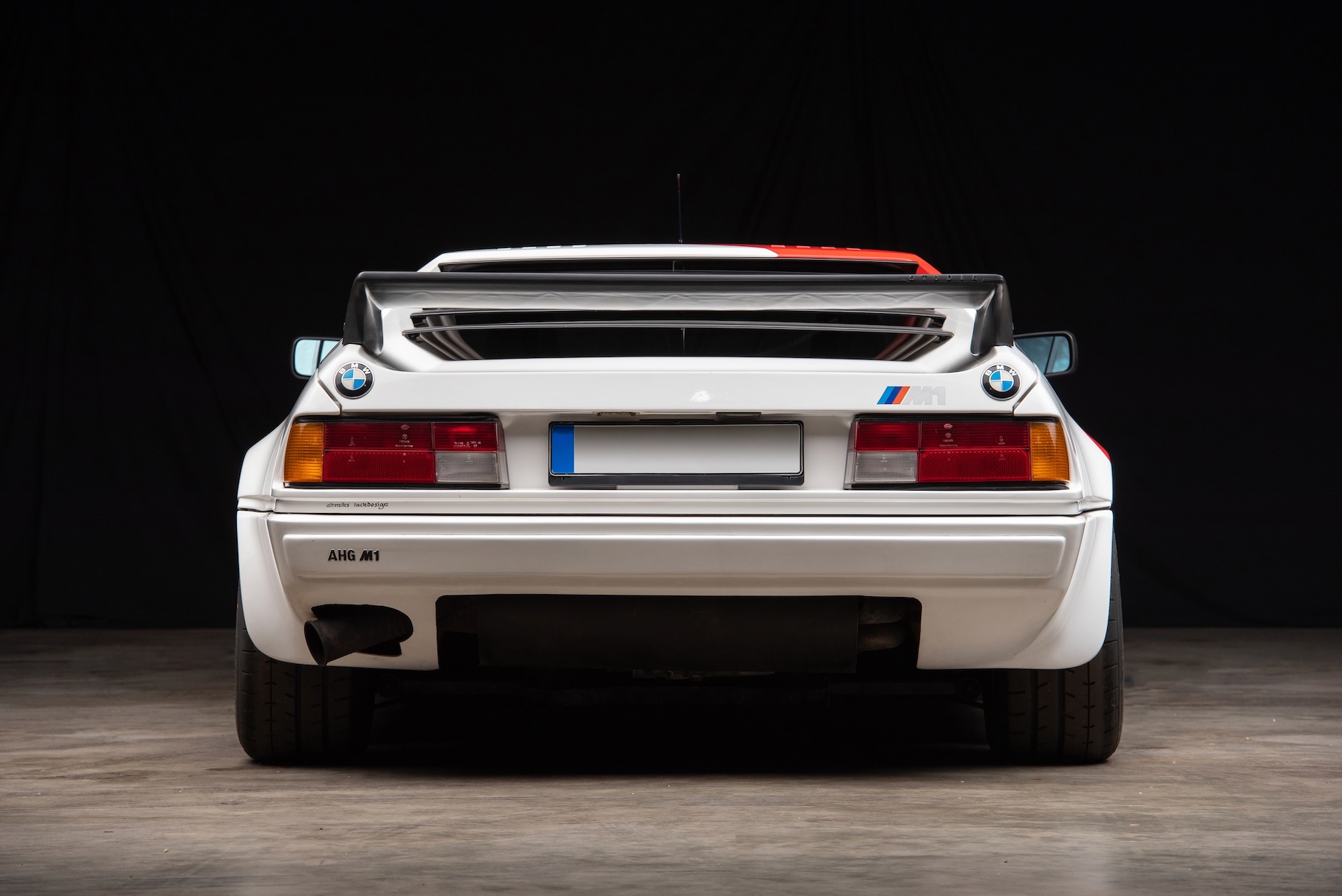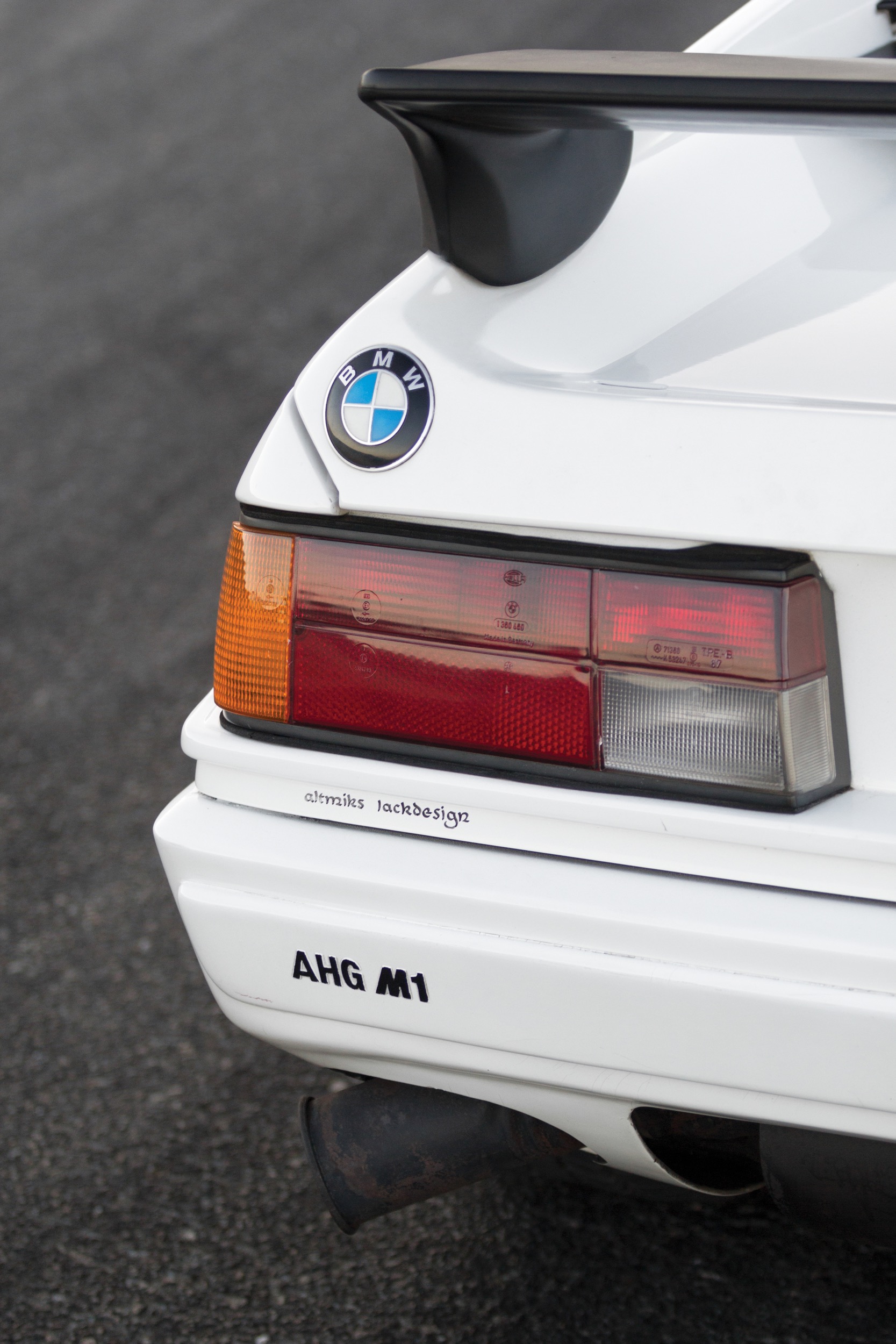 Als die Produktion des M1 1982 auslief, da hatte der Geschäftsführer des BMW-Händlers AHG, Peter Gartemann, die Idee, dass man doch ganze brave M1 in strassenzugelassene M1-Procar verwandeln könnte. Er dachte an eine kleine Serie, vielleicht 10 Stück (wie viele tatsächlich gebaut wurden, das weiss man leider nicht…), die als AHG Studie bezeichnet wurden. Diese Fahrzeuge erhielten in erster Linie einen Karosserie-Umbau, heute würde man das als «wide body» bezeichnen, und natürlich die Renn-Spoiler. Vor allem das Teil hinten soll AHG reichlich Kopfzerbrechen bereitet haben, bis es der TÜV endlich genehmigte. Ein bisschen mehr PS soll AHG seinen Studien auch noch spendiert haben – dass sie keinen Erfolg hatten, lag wohl in erster Linie daran, dass der Umbau sündhaft teuer wurde. Und daran, dass es in den 80er Jahren schwierig war, einen M1 zu verkaufen. Wir zeigen hier die AHG-Studie, die auf Basis des M1 mit der Chassis-Nummer #4301090 aufgebaut wurde – in noch sehr klassischer Kriegsbemalung.