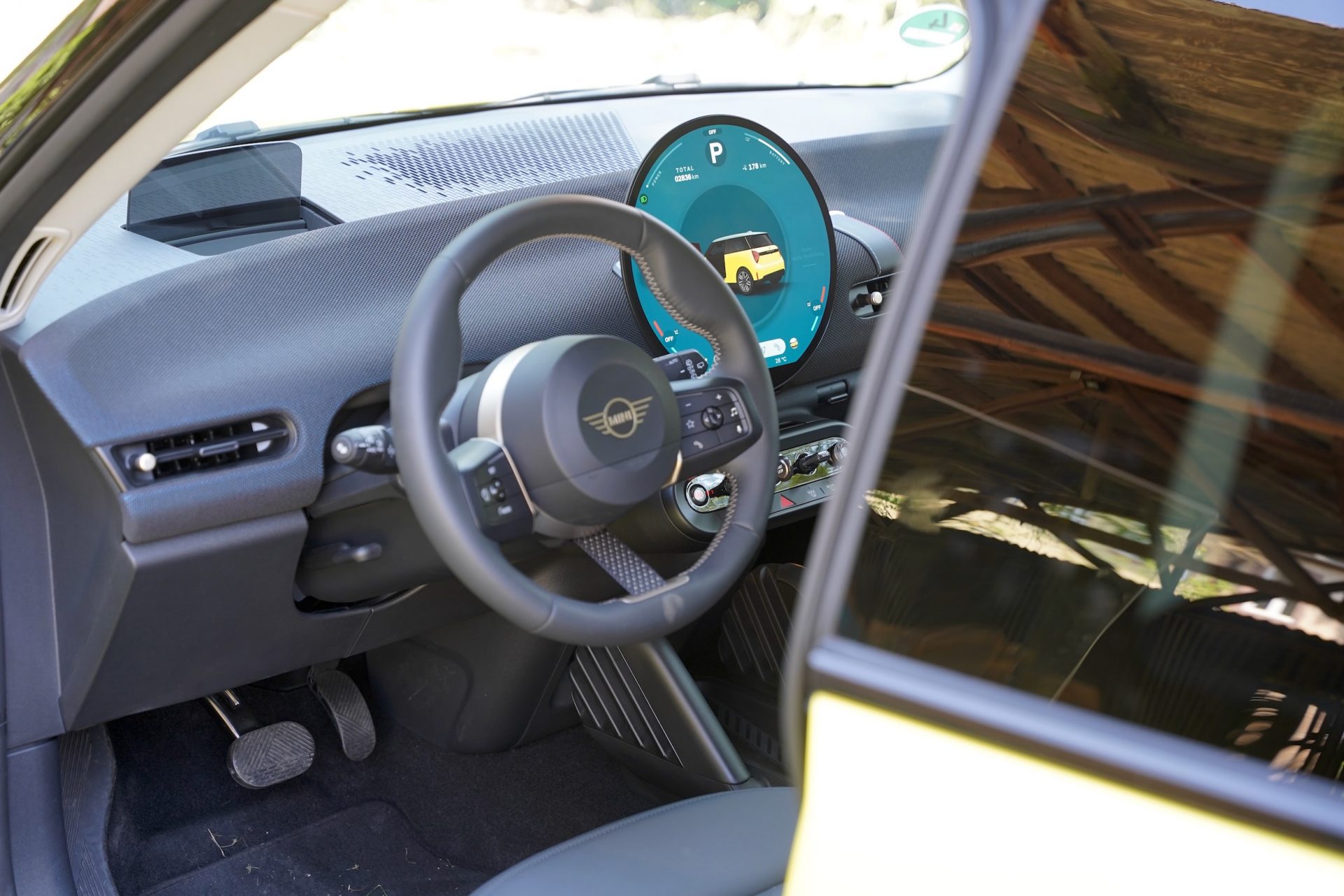 Klar, der rein elektrische Mini ist noch einmal grösser geworden, 3,86 Meter Länge sind es nun. Aber die sind einigermassen gut verpackt, die Front wirkt nicht mehr wie ein fieses Insekt, vor allem das Heck ist viel gefälliger als auch schon. Ja, er ist pummelig, mit einem Leergewicht von über 1,6 Tonnen für einen Mini mehr als nur adipös – für einen Stromer aber ein Leichtathlet. Der Cooper E kommt mit einem 40,7-kWh-Akku (netto 36,8 kWh), 184 PS und 290 Nm; der Cooper SE, den wir gefahren sind, mit einer 54,2-kWh-Batterie (netto 49,8 kWh), 218 PS, 330 Nm. Damit will er in 6,7 Sekunden von 0 auf 100 km/h rennen, gegen oben ist er auf 170 km/h begrenzt. Mehr Zahlen zum SE: Verbrauch nach WLTP ab 14,1 kWh/100 km (forget it), Reichweite mindestens 387 Kilometer (no way). Aber irgendwie ist das alles auch gar nicht so wichtig, grau ist alle Theorie und grün nur des Lebens Baum, irgendwo dazwischen ist auch noch des Pudels Kern – und der ist durchaus fröhlich, clever.