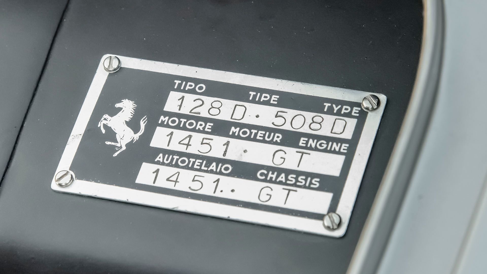 Einer der so seltenen Alu, fertiggestellt am 15.6.1959, ausgeliefert an Bob Grossman, USA. Chassis: Tipo 508D, Motor: Tipo 128F (262,5 PS). Einer der wahrscheinlich acht «Competizione», also mit Alu-Aufbau, dem «neuen» Motor, Tipo 128F (gemessen mit 262,5 PS), Renn-Tank. Wurde 1959 von Grossmann/Tavano bei den 24 Stunden von Le Mans auf den 5. Gesamtrang gefahren. Es war übrigens der erste Auftritt von Grossmann in Le Mans, den Wagen hatte er kurz vor dem Rennen gekauft; er wurde ohne weitere Modifikationen eingesetzt. Auktion: RM Sotheby’s, New York 2017, verkauft für 17’990’000 Dollar!