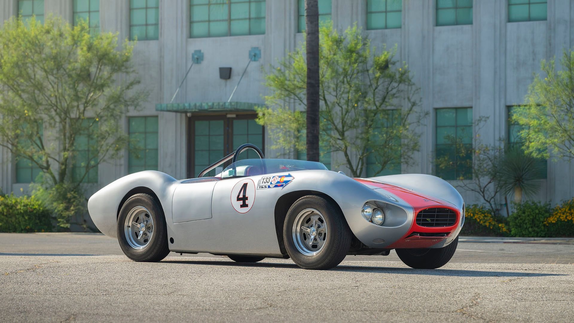 Und es war gut, spätestens ab 1959, als er mit dem XP-5 auf den Markt kam. Es gab eine Mehrzahl von verschiedenen Chassis, entweder wieder aus diesem Chromoly-Stahl – oder dann auf einer modifizierten Triumph-Plattform. Beim Fahrzeug, das wir hier zeigen, einem von wahrscheinlich 15 gebauten XP-5, stammten auch die vorderen Bremsen von Triumph, hinten kamen sie von Chevrolet. Auch die Hinterachse samt dem manuellen 4-Gang-Getriebe kam von Chevy – und selbstverständlich auch der Motor, der berühmte 327er. Weil so ein Bocar nicht einmal 900 Kilo wog, aber über 300 PS zur Verfügung stehen hatte, darf man sich die Fahrleistungen als ganz ordentlich vorstellen. Die Bocar galten damals als feine Renngeräte, sie hatten ein gutes Fahrwerk, sie hatten Kraft, sie waren einfach zu fahren – und sie kosteten nicht die Welt. Aber leider brannte 1961 die kleine Fabrik von Bob Carnes ab; danach hatte er keine Lust mehr, weitere Bocar zu bauen. Beim roten Exemplar unten handelt es sich um Chassis-Nummer XP5043, 2017 für etwas mehr als 150’000 Dollar versteigert.