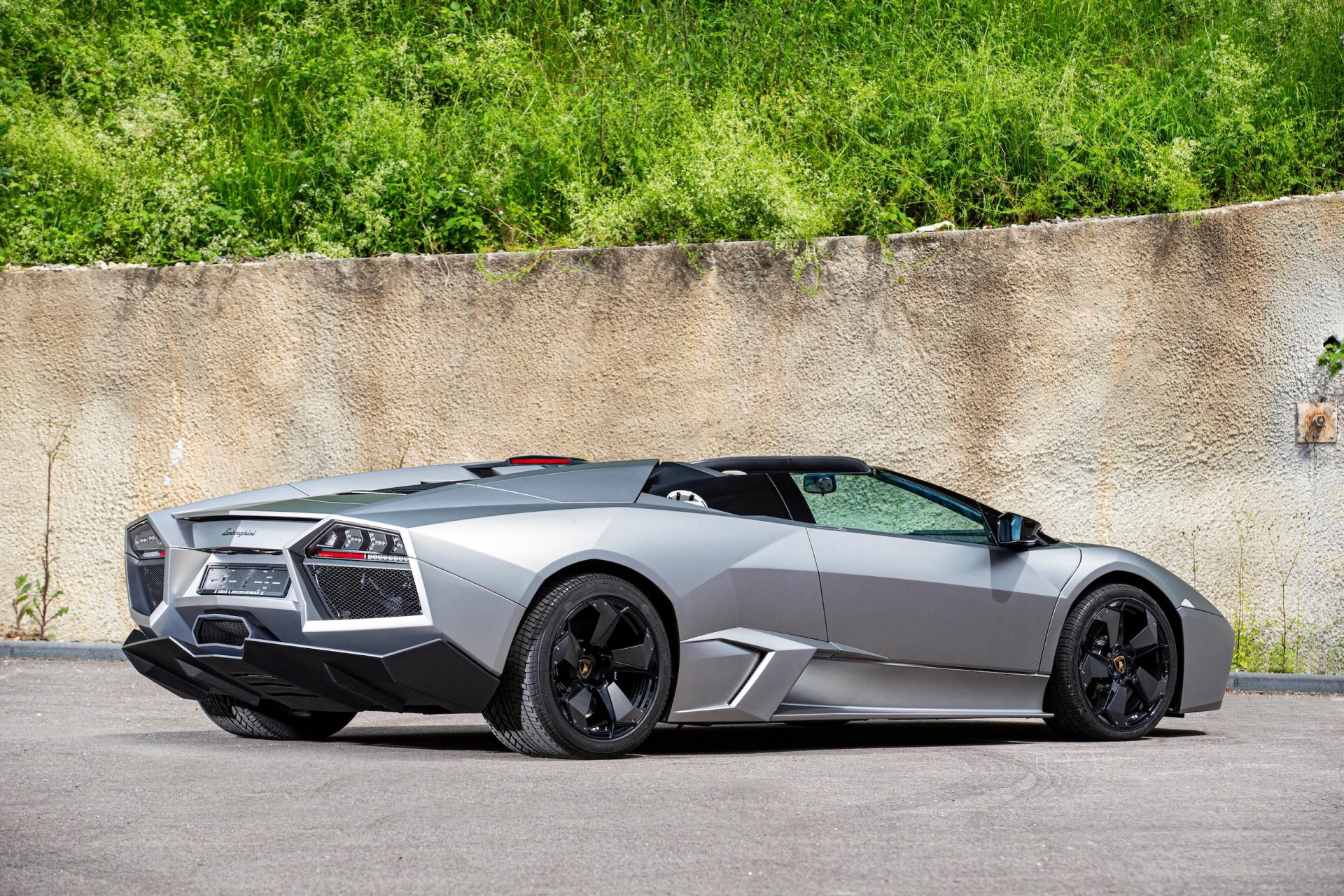 Auktion: Broad Arrow, Zürich 2025, Schätzpreis 1,35 bis 1,65 Millionen Franken, mit diesen Informationen: «One of just 15 Roadsters produced, it was factory-finished in Grigio Reventón: a light matte metallic silver visually distinct from the darker matte grey Grigio Barra color reserved for the Coupe, but retains the standard Reventón’s unique two-tone black and grey interior. Its striking silhouette is distinguished by subtle revisions unique to the Roadster, including a spoiler integrated between the rear fins with a central brake light and a near-horizontal engine cover—giving the Roadster a silhouette as striking as it is purposeful. Reinforced chassis components and deployable roll hoops that spring out in just a few hundred milliseconds in the event of a rollover reestablish structural integrity and safety to match the car’s open-air drama. Beneath its reshaped engine cover lies the uprated 6.45-liter V12 from the Murciélago LP 670-4 SuperVeloce, producing 670 PS and 660 Nm through a six-speed E-gear automatic transmission. This is sufficient to launch the car from zero to 100 km/h in 3.4 seconds and on to a 330 km/h top speed, despite a 25-kilogram weight increase added by its safety systems. The car was sold new by Lamborghini Porrentury in Switzerland, where it was serviced by the dealership before being acquired in 2019 by its current caretaker. Remaining in storage at the dealership in Switzerland since purchase, it has been driven sparingly and shows just 2,423 kilometers at cataloging. A new battery has also been fitted».