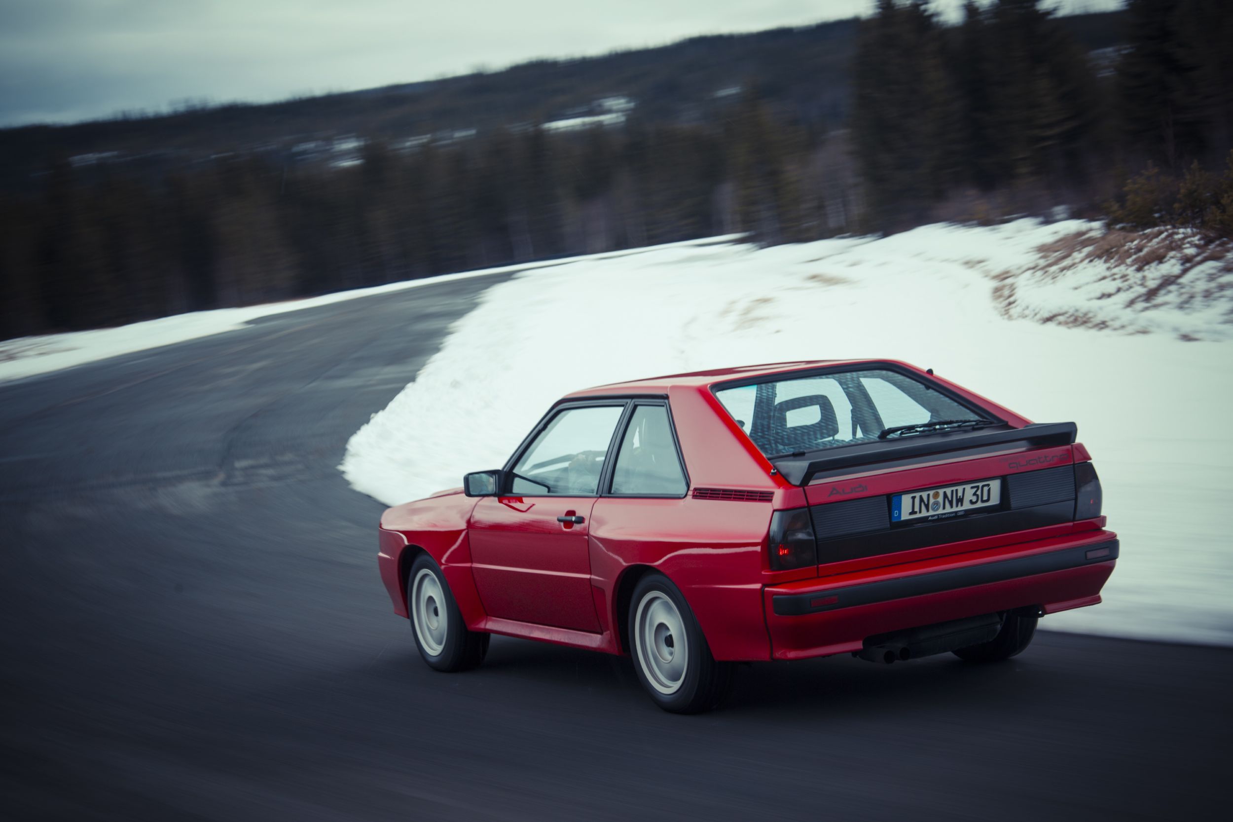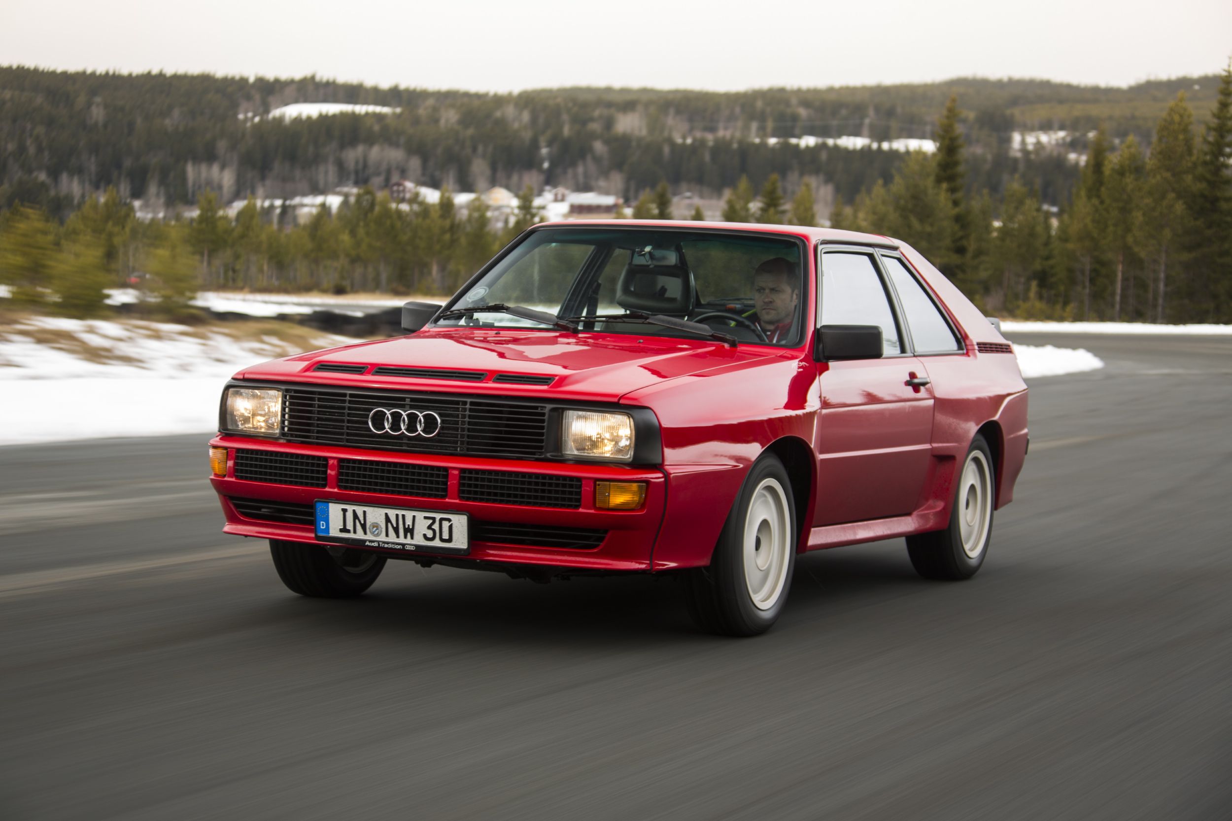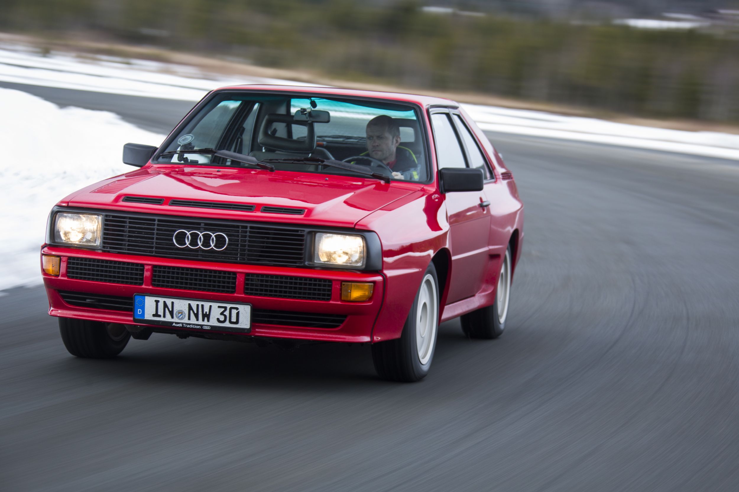 Viel lustiger war dann die leider auch zu kurze Ausfahrt mit den Sport quattro, dem Kurzen. Ein spezielles Fahrzeug von «audi tradition», der vierte von sechs (bei Baur in Stuttgart) gebauten Prototypen, offiziell geboren am 1.12.1983. 306 PS, 1300 Kilo, wunderbar in Tornado-Rot lackiert. Innen: perfekt, wohl fast schöner als neu – und doch sieht das, mit Ausnahme des Lederinterieurs und der Sportsitze, aus wie einst in einem Golf (noch erstaunlich für ein Gefährt, das doch 200’000 Märker kostete). Schlüssel drehen, der Fünfzylinder erwacht zum Leben: dies Knurren ist eine Herrlichkeit. Das Getriebe ist ziemlich schwergängig, aber das ist ok, wir mögen das ja, wenn man noch etwas arbeiten darf. Zuerst eine Einführungsrunde, die Verhältnisse sind etwas schwierig, halb Asphalt, halt Schnee und Eis, es sind Spikes mit kurzen Nägeln montiert. Was man sofort merkt: er will bei Laune gehalten werden, der 2,1-Liter-Motor, unter 3000/min geht gar nix, dann kommt die Pracht aber mit Macht. Natürlich ist da der Respekt, und auch die Strassenverhältnisse machen es nicht einfacher – und dann geht er mir in der letzten Kurve auch noch massiv hinten weg, der Kerl, vorne hat er Grip, hinten tanzt er im Schnee. Aber irgendwie geht es ja immer. Oder zumindest: meistens.