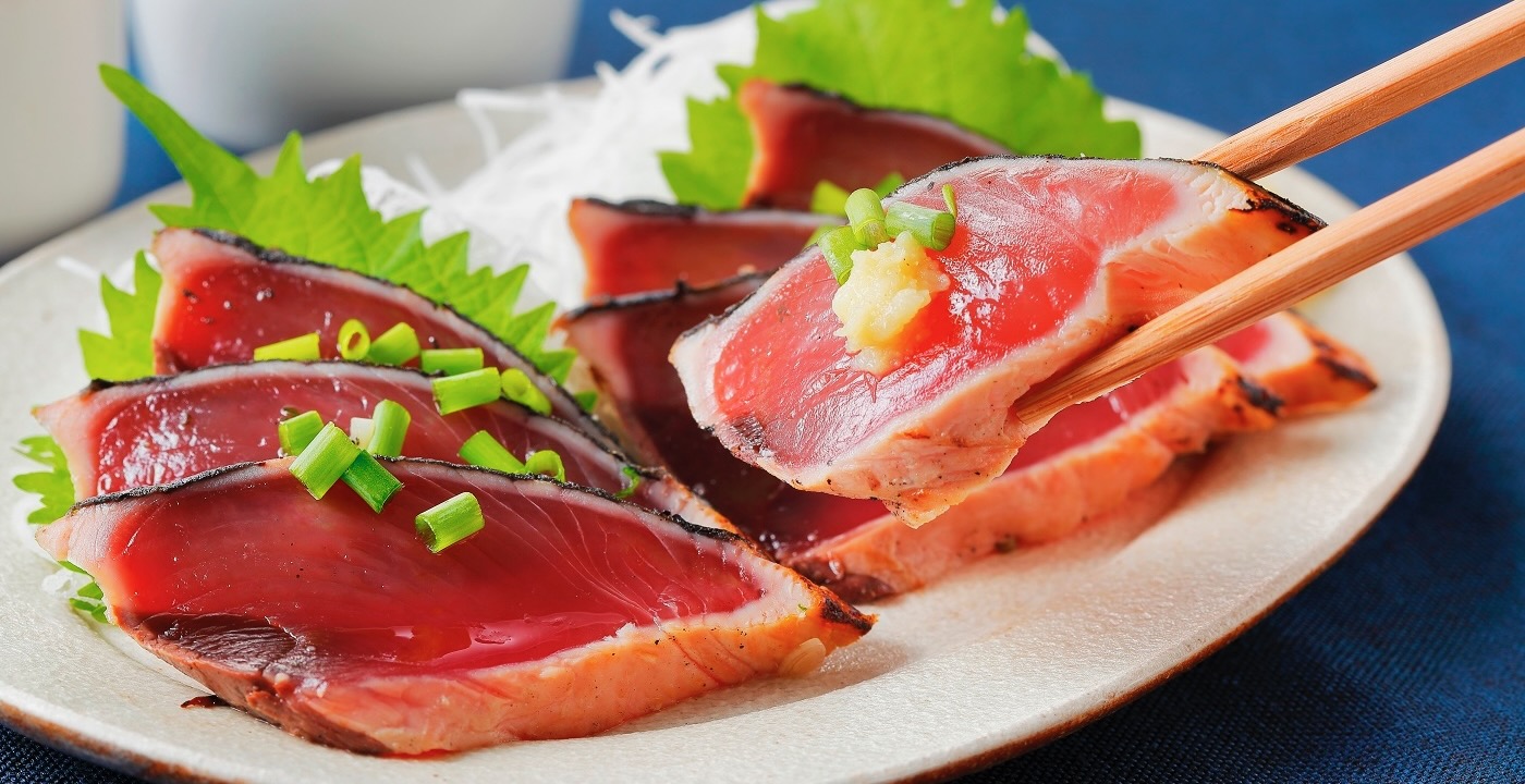 Der gestreifte Thunfisch, bei uns besser bekannt als Bonito, ist eines der vielseitigsten und wichtigsten Lebensmittel der japanischen Küche. Für Sushi und Sashimi werden katsuo vor allem im Frühling und Frühsommer verwendet, wenn die Fische aus den warmen Strömungen des Pazifik den Küsten Japans entlang nach Norden ziehen – die hatsu katsuo (erste Bonito) gelten als grosse Delikatesse. Und nicht nur für die Gourmets symbolisieren sie den Sommeranfang. Im Herbst heissen die nach Süden schwimmenden Fische dann modori gatsuo, heimkehrende Bonito, und sind fetter, von festerer Konsistenz. Diese Herbst-Fische werden für eine der wunderbarsten japanischen Spezialitäten verwendet, tataki, gestreifter Thunfisch, der über brennendem Stroh gebraten wird (das ist auch so ein bisschen nötig, um den doch eher starken Fisch-Geruch des Bonito zu vertreiben).