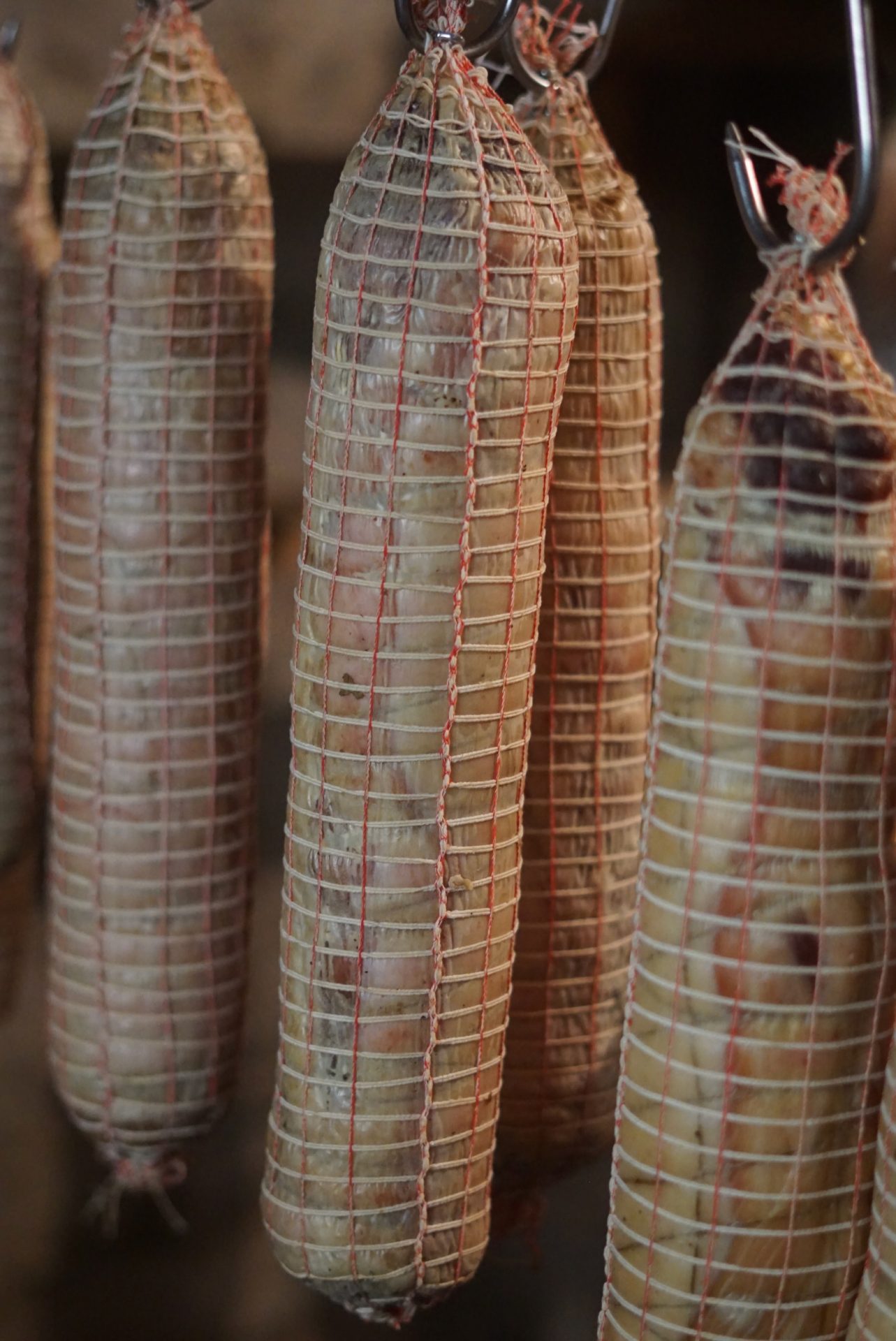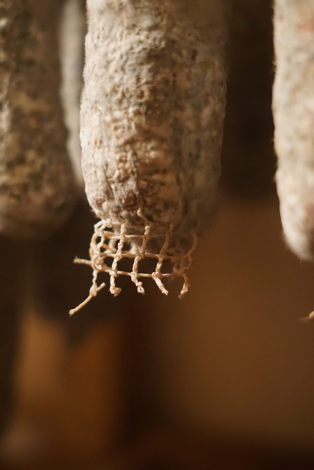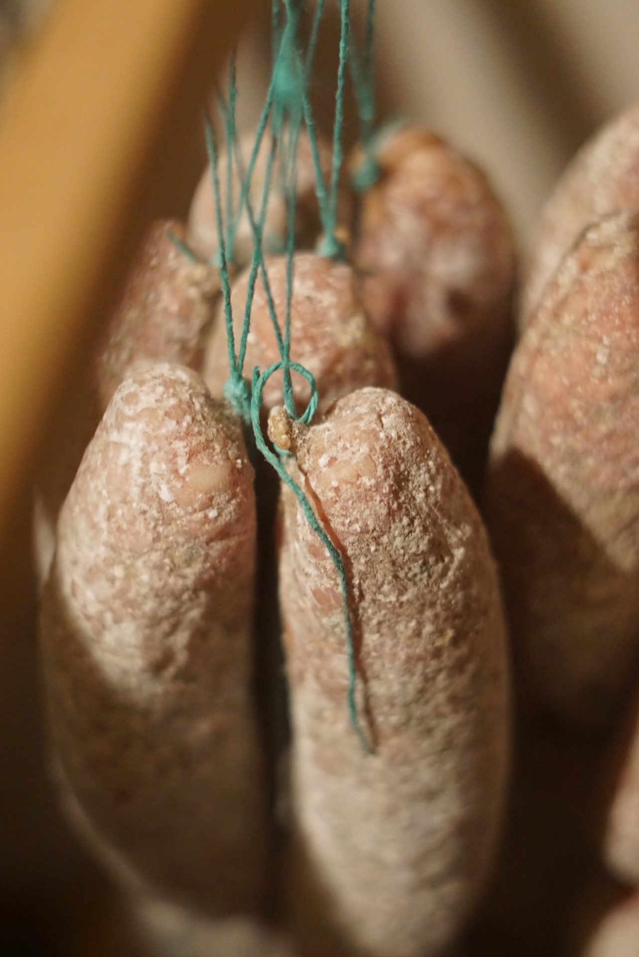 Salami is a salted sausage. The art of curing meat with salt to preserve it for longer is around 5,000 years old; the Romans and Etruscans then refined it. And as is almost always the case when it comes to culinary traditions, the product we know today was brought to true greatness in Emilia-Romagna. Once, from around the 15th century onwards, it was mainly donkey and mule meat that was processed into the well-known, elongated dry sausage (which is still available today), but nowadays, not only at Piccoli, it is pork and beef cuts – the prime cuts, back fat and even more belly fat – combined with the house recipe of spices (salt, pepper, garlic, a little sugar, but under no circumstances nitrite curing salt), and a little wine (around 3 litres of Ticino Merlot per 100 kilos of meat) that are not minced too finely by machine and then stuffed into natural casings. These stuffed casings are then tied by hand, pricked by hand (to ensure no air remains in the sausage), and hung up for an initial drying. Afterwards, they are taken to the cellar, for at least two months, sometimes even for six months. There they are allowed to mature at a temperature of 12 to 15 degrees and a (controlled) humidity of 80 per cent. The characteristic white skin on Piccoli’s sausages does not come from a ‘vaccination’ or even from rice flour (as with industrial salami), but from the spores of noble moulds – yes, that includes mould – in the ‘Cantina’; this is why it is irregular in colour and distribution. During drying, the sausages lose around 30 per cent of their weight; Fausto recognises the ‘mature’ sausages by their colour.
